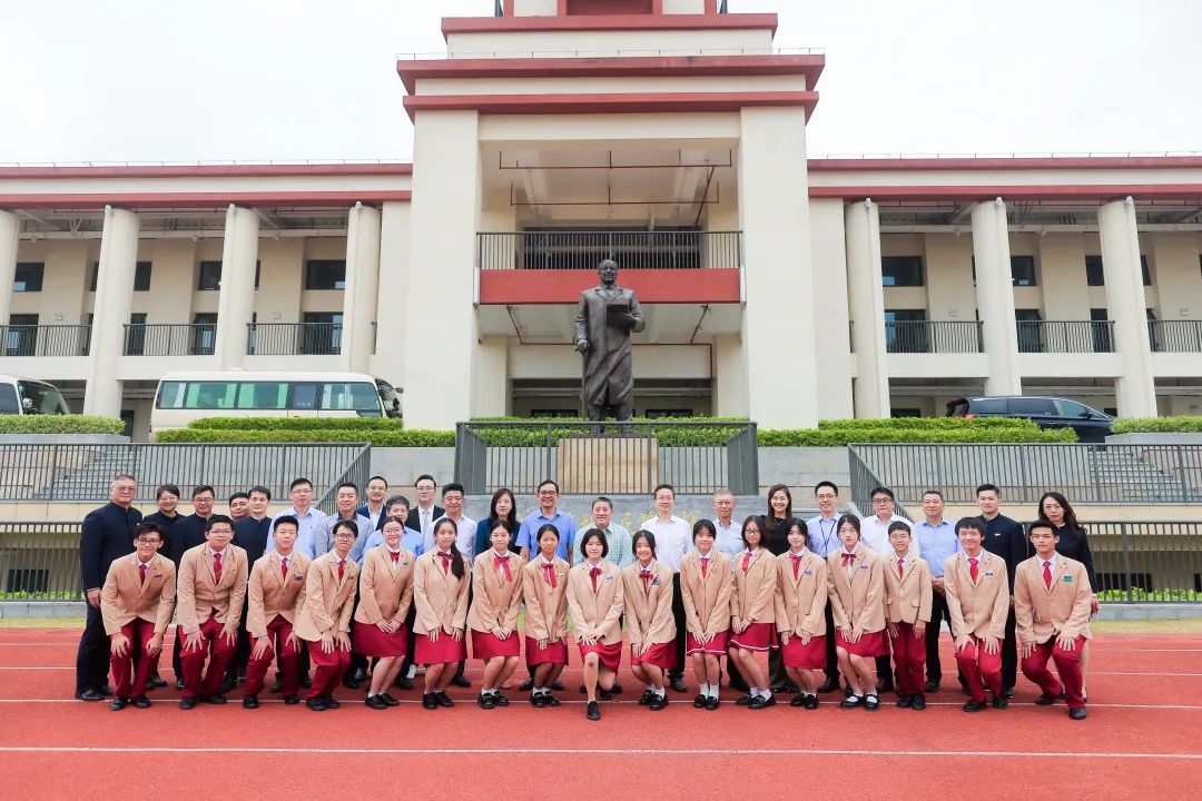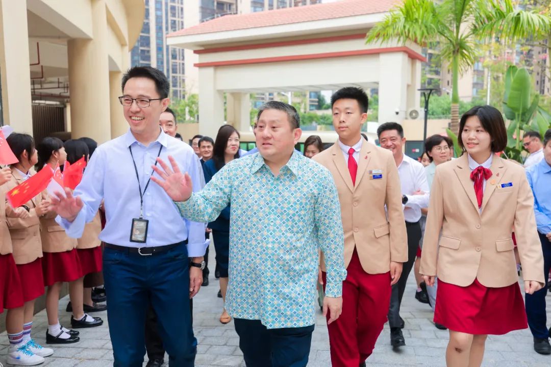 年初,新加坡总理李显龙先生曾来到广州新侨学校进行视察,并对新侨引入的新加坡教育经验与教学法表示肯定。今年5月陈海泉大使来华履新,此次专程访校也再次表达了对学校发展的关心以及对中新融合课程特色的高度认可。 恰逢学校运动会彩排,陈海泉先生在学校师生代表的陪同下,体验了新侨的学堂文化。作为世界名校新加坡南洋华侨中学(简称“华中”)的联属学校,新侨不仅延续了百年华中“自强不息”的校训,也延续了其独特的学堂文化。 学生领袖还向陈海泉大使详细介绍了新侨的学堂制:进入新侨的每位学生,将被分进一个学堂,学校鼓励学生建立共同目标,协作奋进,向同辈学习,为学弟学妹作出榜样。学生也可以通过各种学堂活动学习如何组织,如何合作,累积关于领导力的知识与经验。比如即将到来的校运会,就是以学堂为单位进行组织。 参访结束前,陈海泉大使与新侨师生代表在嘉庚像前合影留念并驻足交流。